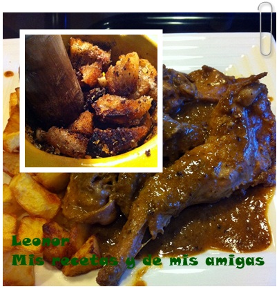 2) Saltear en el aceite los ajos picados, el pan desmenuzado, el romero y el higadito del conejo picadito. Cuando está todo sofrito, lo escurrimos y machacamos en un mortero, añadiendo el pimentón poco a poco.